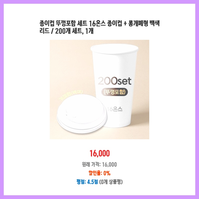 행사용으로 종이컵이 많이 필요했는데, 뚜껑까지 포함된 세트라 편리하고 경제적이어서 구매했습니다. 16온스 용량도 넉넉하고, 200개나 들어있어서 여러 번 사용할 수 있어 좋습니다. 흰색이라 깔끔한 느낌도 마음에 듭니다.