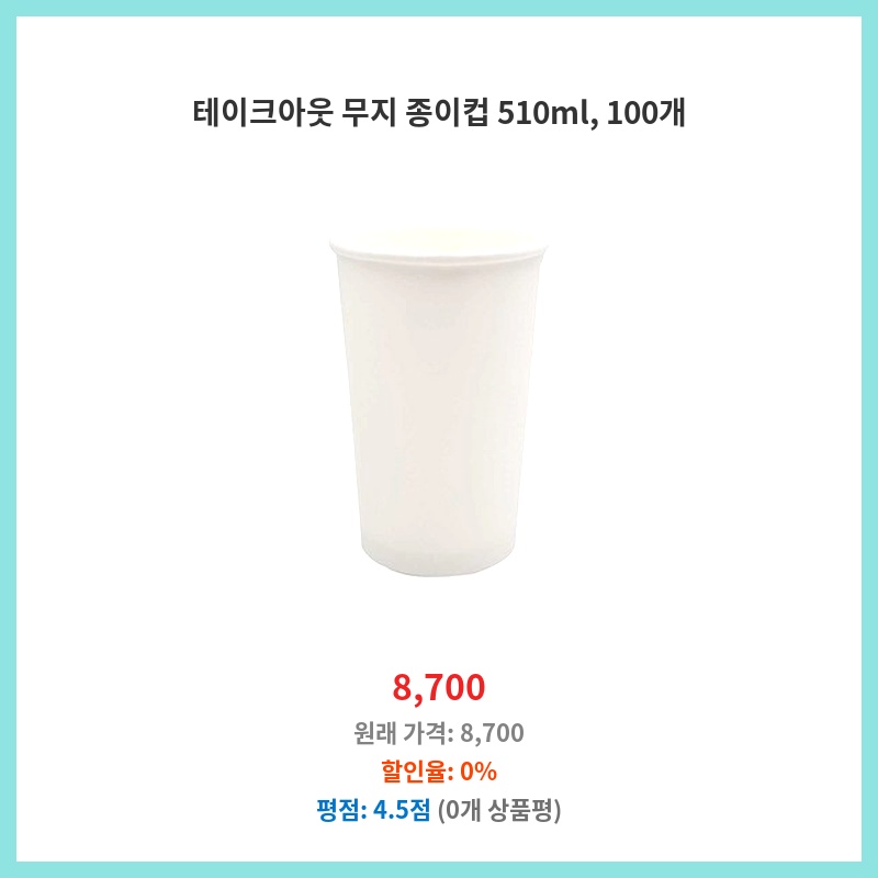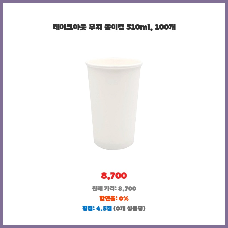 매장에서 사용할 종이컵이 필요했는데, 510ml 용량에 100개들이라 가성비가 좋았습니다. 무지 디자인이라 어떤 음료에도 잘 어울리고, 일회용이라 편리하게 사용할 수 있어서 구매했습니다.