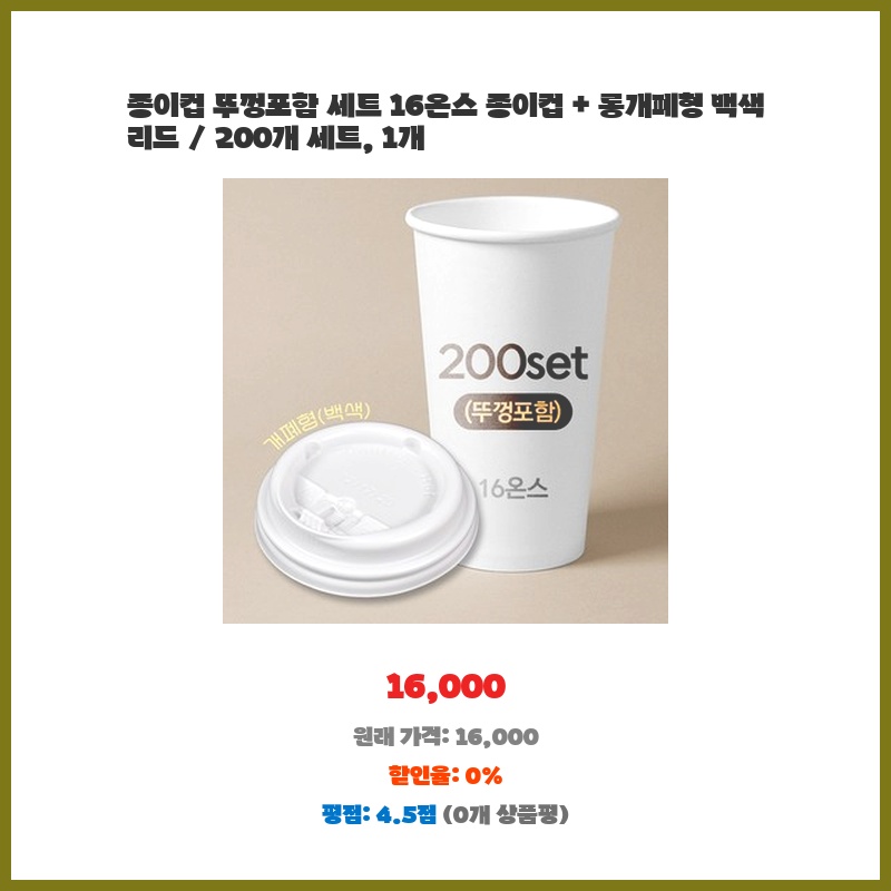 종이컵 뚜껑포함 세트 16온스 종이컵 + 롱개폐형 백색 리드 / 200개 세트, 1개
