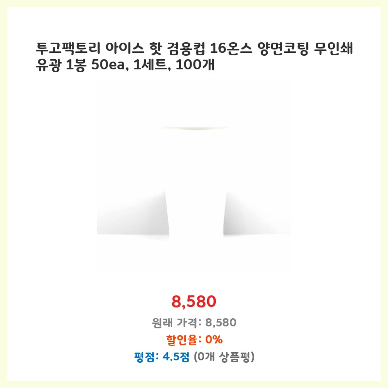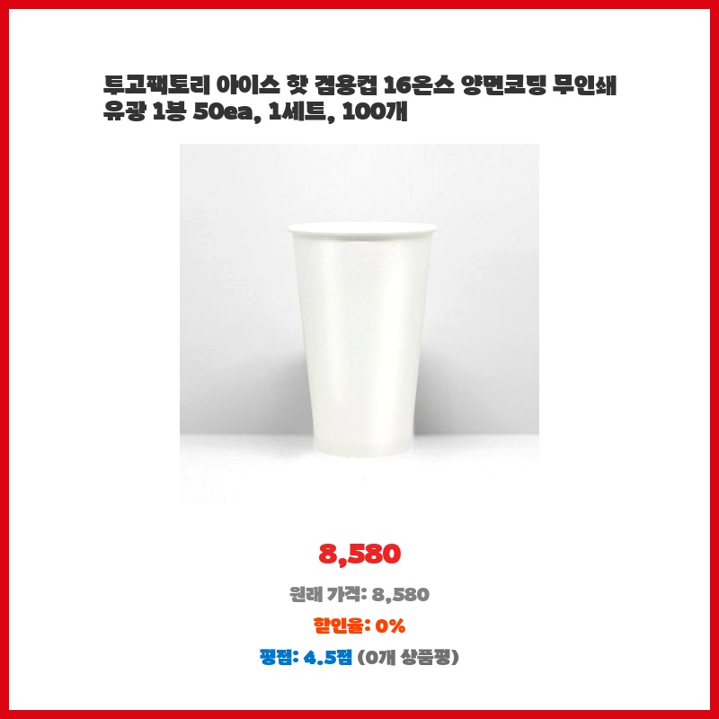 아이스, 핫 모두 사용 가능한 16온스 컵이 필요했는데, 양면 코팅으로 내용물이 새지 않고 50개씩 묶여 있어 관리 및 사용이 편리할 것 같아 구매했습니다. 무인쇄라 디자인 제약 없이 활용 가능한 점도 좋았습니다.