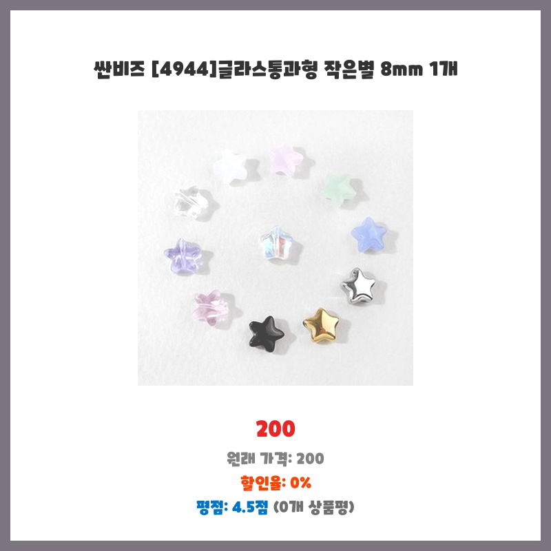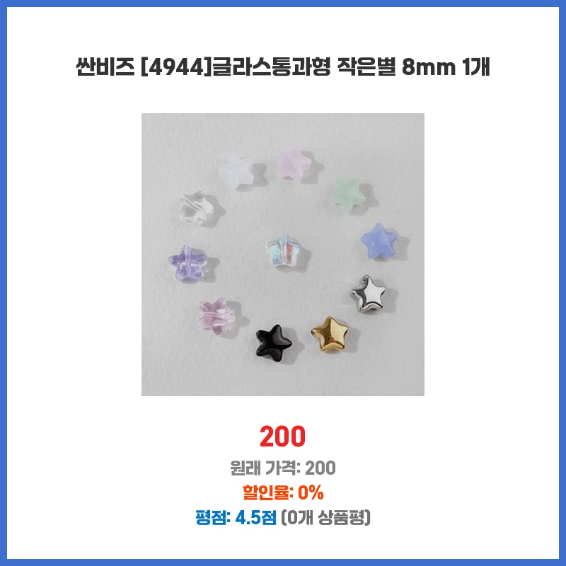 작고 귀여운 글라스 통에 들어있는 8mm 작은 별이 200원이라는 저렴한 가격에 매력적이었습니다. 소량으로 필요했기에 개별 구매가 가능한 점도 좋았습니다. 작은 공예품 만들기에 적합해 보였습니다.