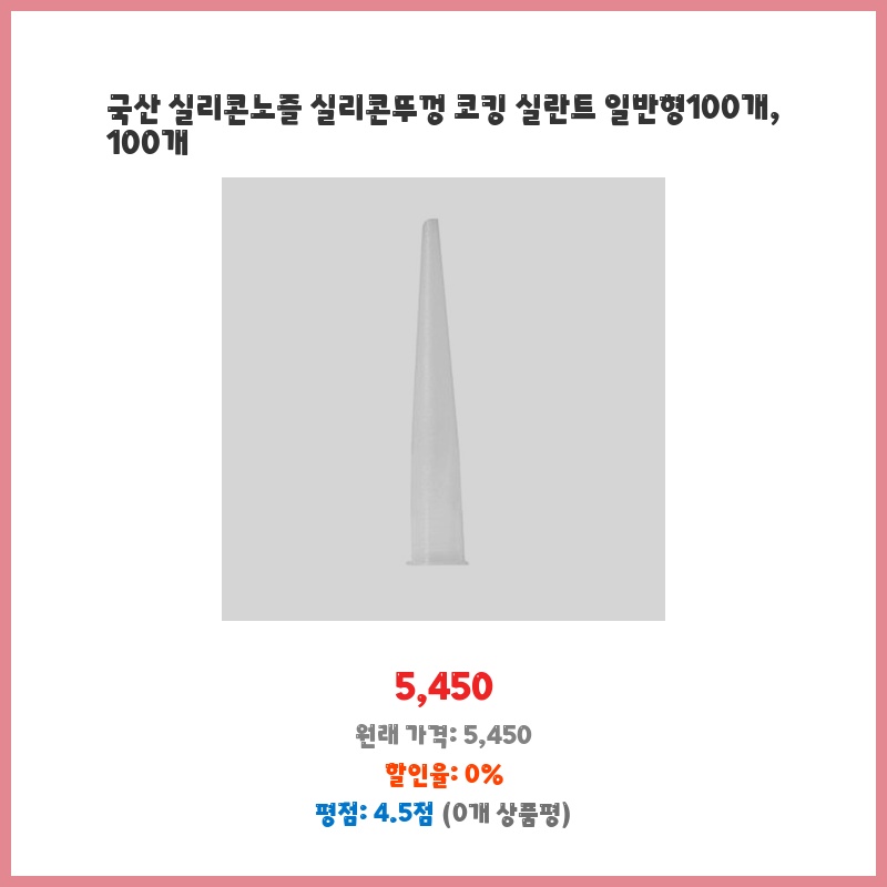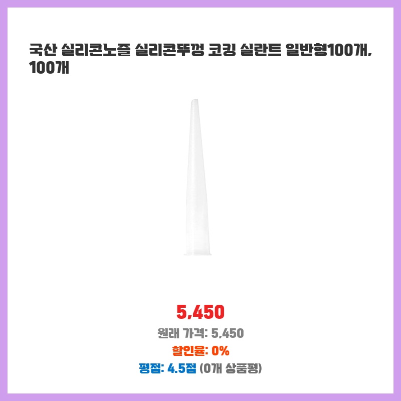 100개나 들어있어 가성비가 좋고, 국산 실리콘이라 믿을 수 있어서 구매했습니다. 실리콘 뚜껑과 노즐이 함께라 코킹 작업이 편리할 것 같아요. 다양한 용도로 사용 가능할 것 같아서 기대됩니다.