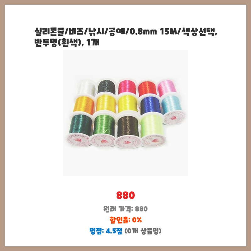 비즈 꿰는 작업에 사용했는데, 부드럽고 잘 늘어나지 않아 작업하기 편했습니다. 15M나 되니 넉넉하게 사용하고 있습니다. 가격 대비 만족도가 높습니다.