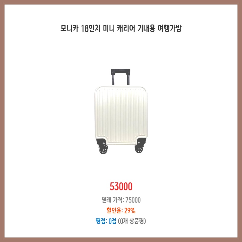 여행을 자주 다니지만 큰 캐리어는 부담스러워 미니 기내용을 찾던 중 디자인과 가격이 마음에 들어 구매했습니다. 튼튼해 보이는 소재와 수납공간도 충분해 보였습니다. 실제로 기내 반입에도 문제 없었습니다.