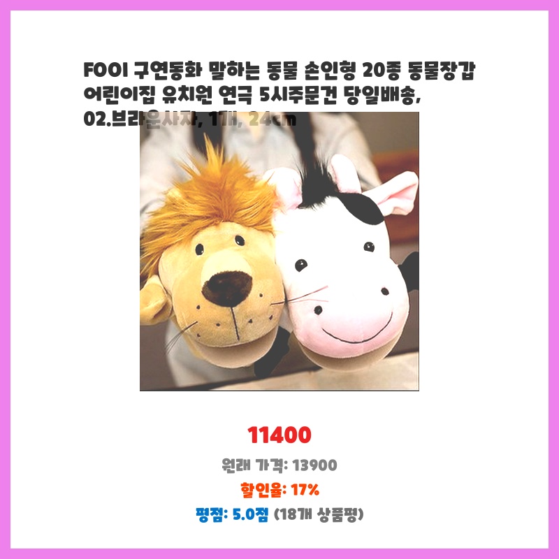 아이 유치원 연극 발표회 준비를 위해 손인형이 필요했는데, 20종이나 되는 다양한 동물과 5시 이전 주문 시 당일 배송이라는 점이 매력적이었습니다. 브라운 사자의 디자인도 마음에 들었고, 크기도 적당해 보였습니다.