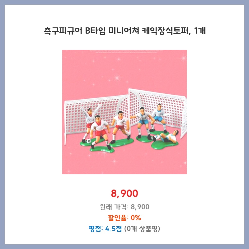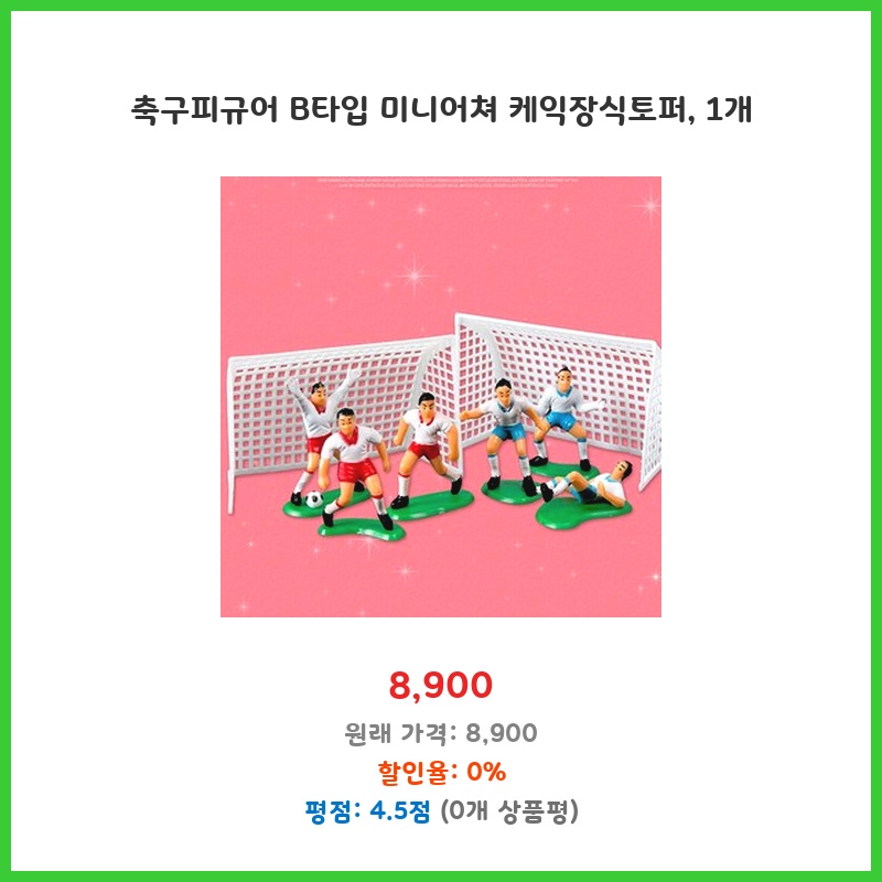 아이 생일 케이크에 축구를 좋아하는 아이를 위한 특별한 장식을 하고 싶어서 구매했습니다. 미니어쳐라 케이크 크기에 맞춰 사용하기 편리하고, 디테일이 섬세해서 만족스러울 것 같았습니다. B타입 디자인도 마음에 들었습니다.