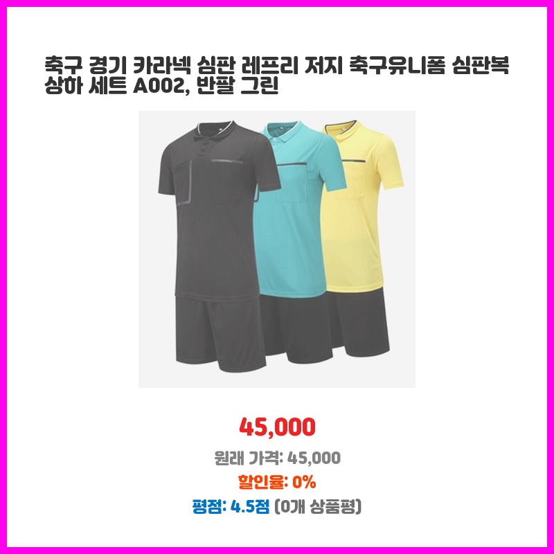 심판복을 새로 장만해야 했는데, 가격 대비 품질이 좋아 보였습니다. 깔끔한 디자인과 편안한 착용감이 중요했는데, 상품 이미지와 설명이 마음에 들었습니다. 반팔이라 여름철 경기에 적합할 것 같아 구매했습니다.