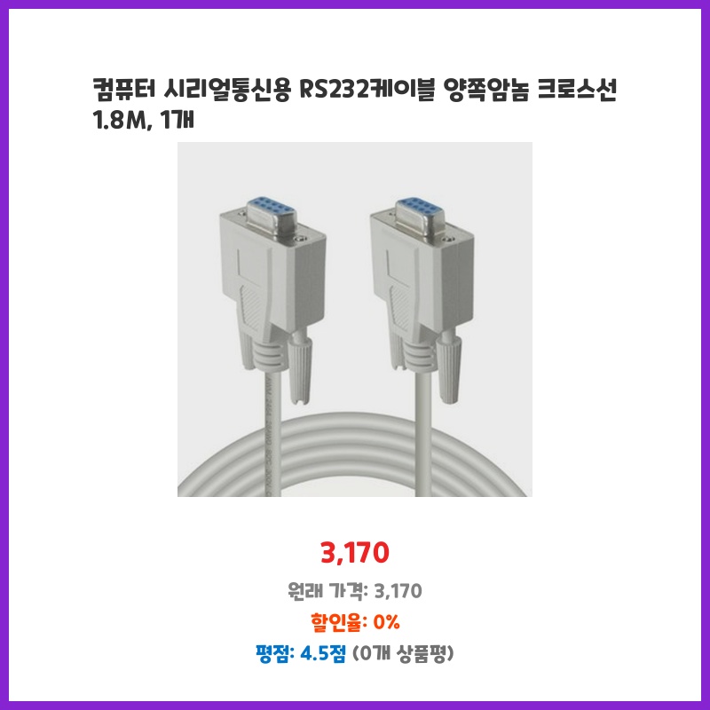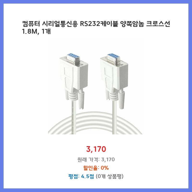 기존 RS232 케이블이 고장나서 교체용으로 구매했습니다. 암-암 타입이라 연결이 편리하고, 1.8m 길이로 작업 공간 제약 없이 사용 가능합니다. 가격도 저렴해서 부담없이 구매했습니다.