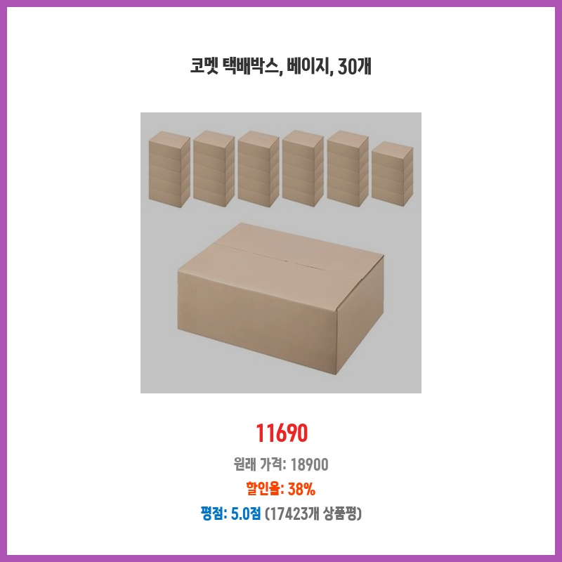 택배 포장이 많아서 저렴하고 튼튼한 박스가 필요했습니다. 베이지 색상이 깔끔하고 50개들이라 한번에 구매해서 편리할 것 같아 선택했습니다. 재질도 괜찮고, 사이즈도 다양하게 활용 가능할 것 같습니다.