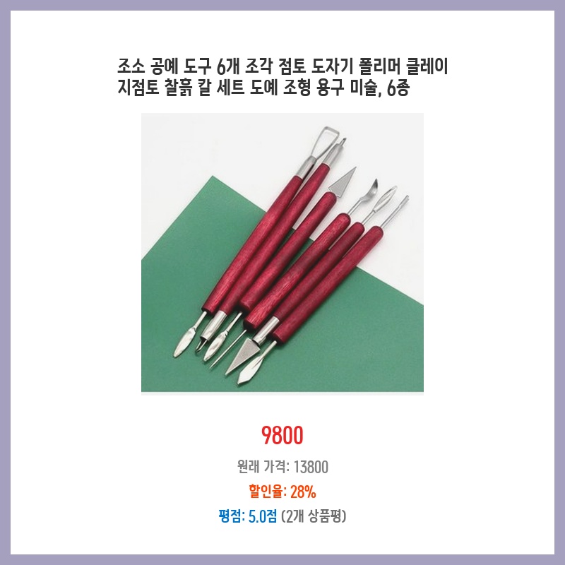 다양한 조소 작업에 필요한 기본 도구 6종이 한 세트로 구성되어 가성비가 좋습니다. 개별 구매보다 저렴하고, 보관도 용이하며, 초보자도 쉽게 사용할 수 있는 실용적인 구성입니다. 점토, 폴리머 클레이 등 다양한 재료에 사용 가능합니다.