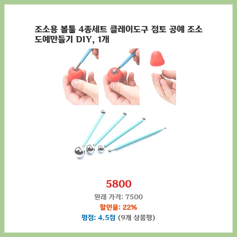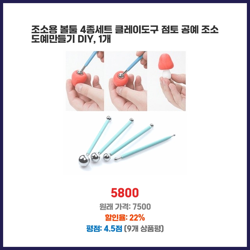 생각보다 훨씬 튼튼하고 다양한 도구들이 들어있어 만족스러워요. 클레이 작업이 더욱 수월해졌습니다. 가격 대비 성능이 매우 좋네요!