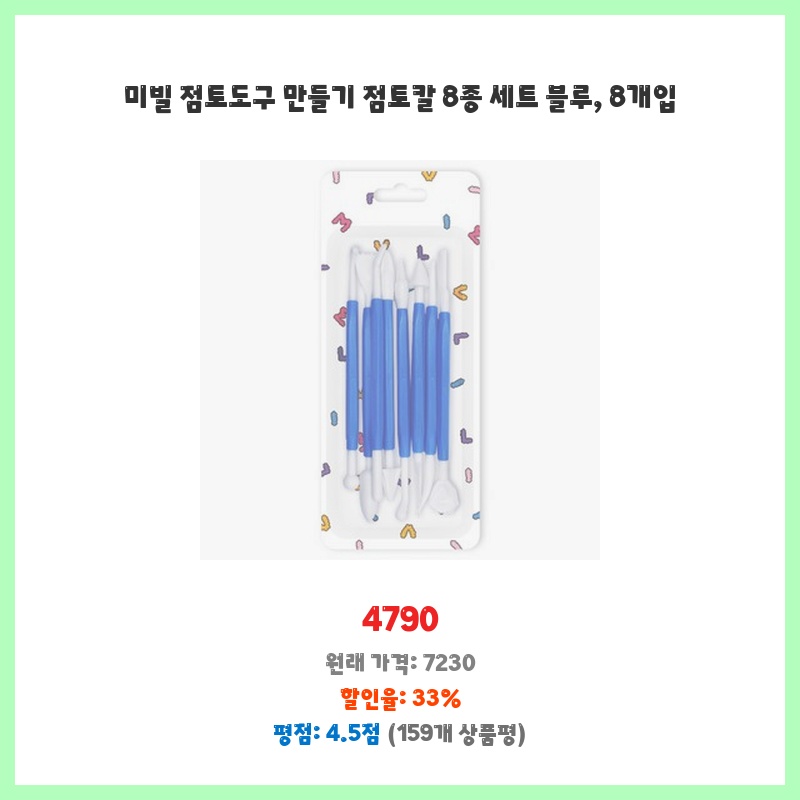 다양한 모양의 점토 조각을 만들고 싶어서 8종 세트를 구매했습니다. 블루 색상도 마음에 들고, 칼날이 깔끔하게 잘 들어서 작업이 수월할 것 같았습니다. 가격 대비 구성이 좋아 보였습니다.