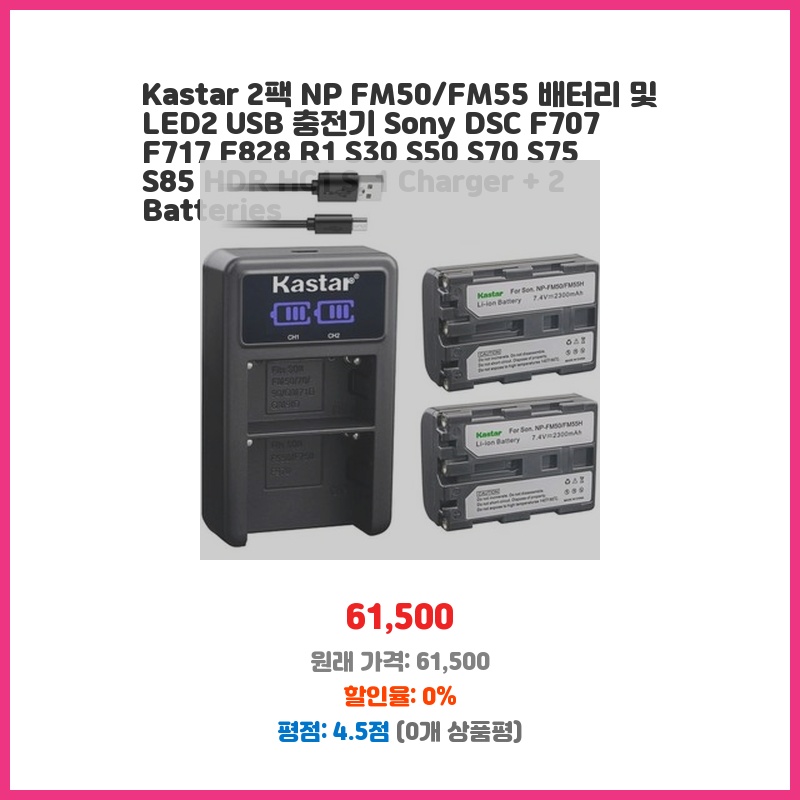 기존 배터리 수명이 짧아져 추가 배터리가 필요했고, Sony 카메라와 호환되는 Kastar 제품의 가격이 합리적이어서 구매했습니다. 2개의 배터리와 충전기가 함께 제공되어 편리하게 사용할 수 있습니다.