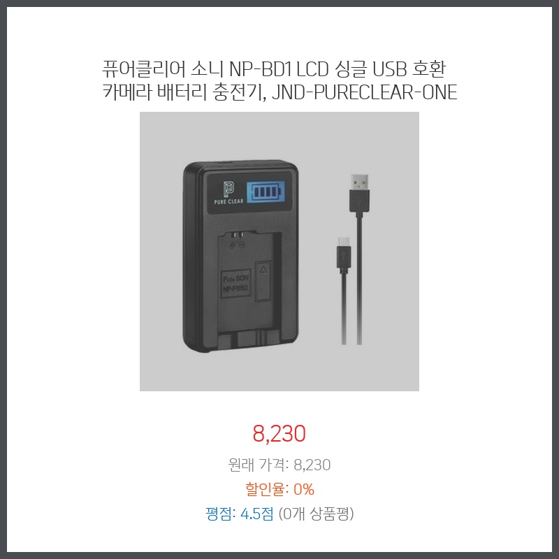 퓨어클리어 소니 NP-BD1 LCD 싱글 USB 호환 카메라 배터리 충전기, JND-PURECLEAR-ONE
