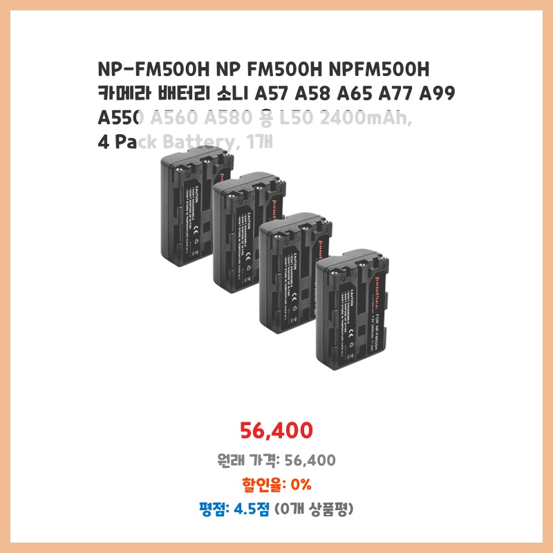 기존 배터리 수명이 짧아져 여러 개의 배터리가 필요했고, 소니 카메라와 호환되는 NP-FM500H 배터리 4개를 저렴하게 구매할 수 있어서 좋았습니다. 2400mAh 용량으로 촬영 시간도 충분했습니다.