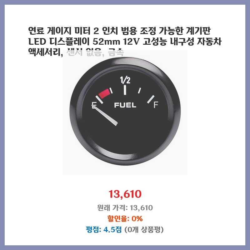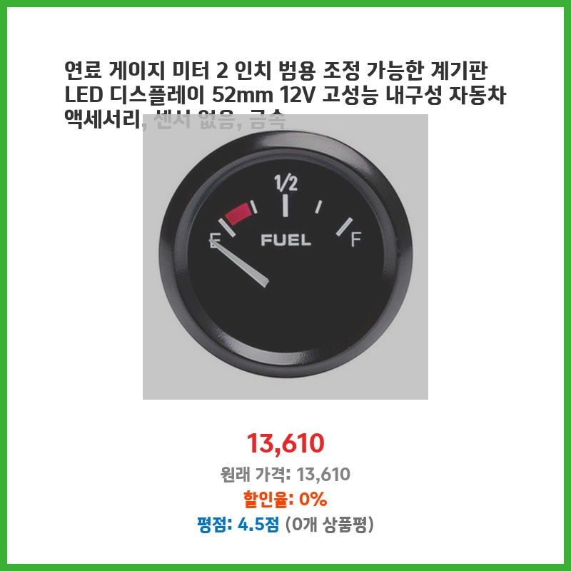 기존 연료 게이지가 고장나서 교체용으로 구매했습니다. 52mm 표준 사이즈라 호환성이 좋고, LED 디스플레이라 시인성이 뛰어나다는 점이 마음에 들었습니다. 금속 재질이라 내구성도 좋아 보입니다. 가격 대비 괜찮은 제품이라고 생각합니다.
