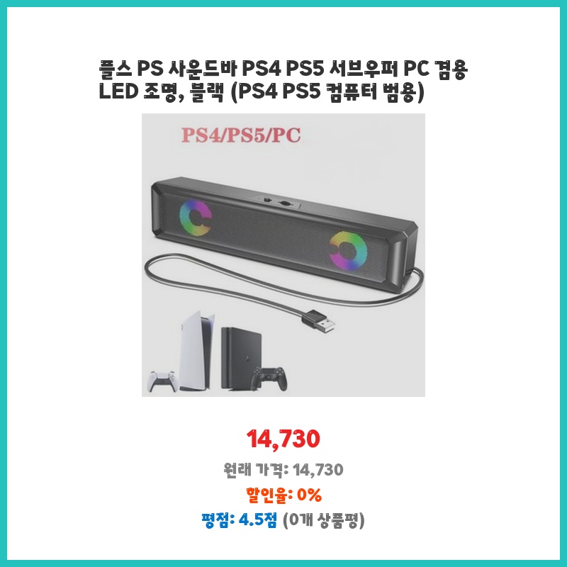 플스 PS 사운드바 PS4 PS5 서브우퍼 PC 겸용 LED 조명, 블랙 (PS4 PS5 컴퓨터 범용)