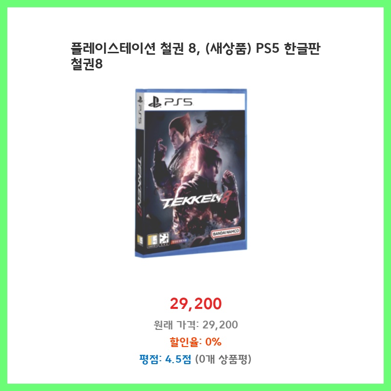 PS5 한글판 철권8을 새 상품으로 저렴하게 구매할 수 있어 좋습니다. 철권 시리즈 팬으로서 최신작을 플레이하고 싶었고, 한글화 지원으로 편리하게 게임을 즐길 수 있다는 점이 매력적입니다. 새 상품이라 불량 걱정 없이 안심하고 플레이할 수 있습니다.