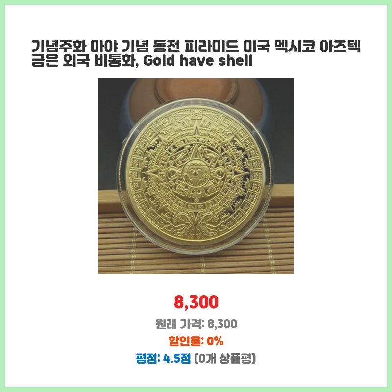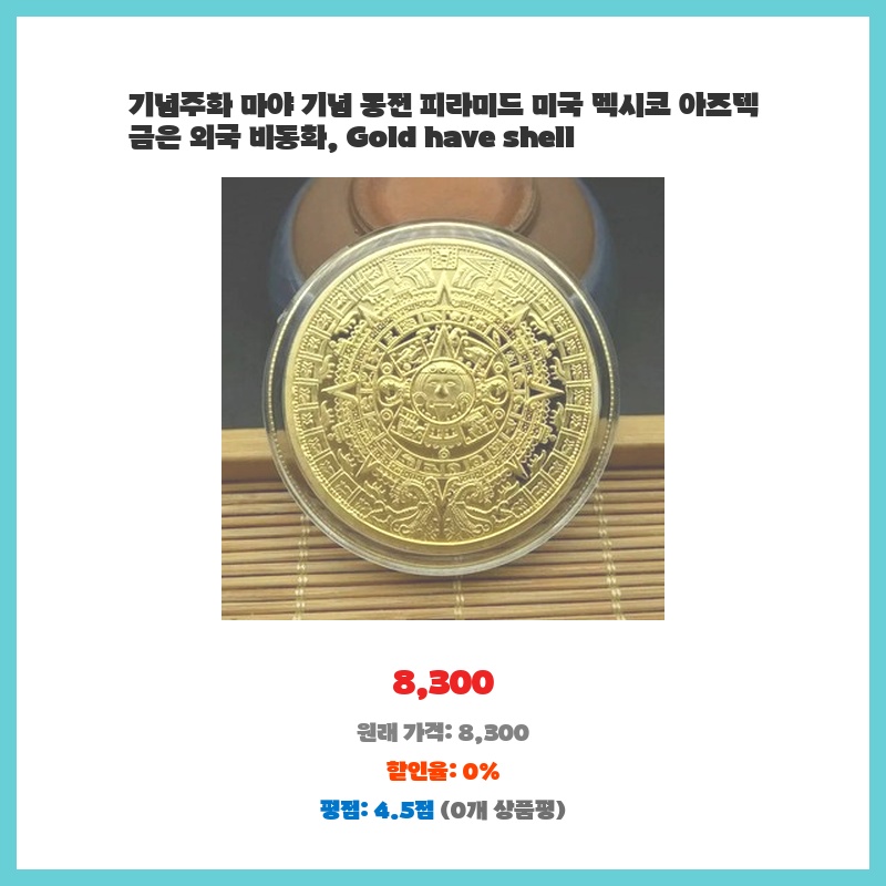 마야 문명에 대한 관심과 독특한 디자인에 끌려 구매했습니다. 금과 조개껍데기 장식이 고급스럽고, 소장 가치가 높을 것 같아 만족스럽습니다. 비통화이지만, 역사적 가치를 지닌 기념품으로서 의미가 있습니다.