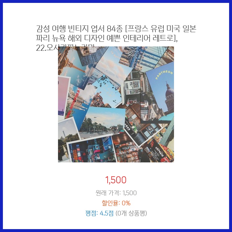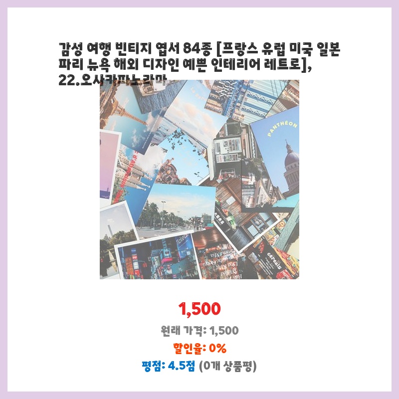 84종의 다양한 빈티지 엽서가 1500원이라는 저렴한 가격에 제공되어 부담 없이 구매했습니다. 프랑스, 일본 등 다양한 국가의 디자인이 포함되어 있어 인테리어 소품으로 활용하기 좋을 것 같습니다. 오사카 파노라마 엽서도 기대됩니다.