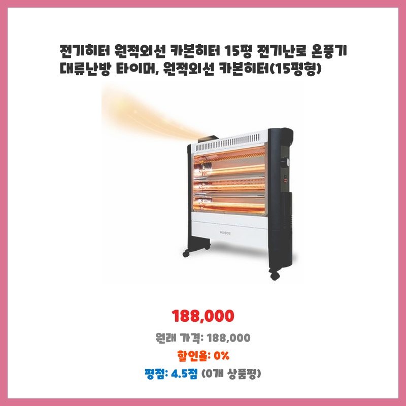 15평 거실 난방을 위해 구매했습니다. 원적외선 방식이라 몸이 따뜻하고, 대류난방과 타이머 기능까지 있어 편리할 것 같아 선택했습니다. 카본히터라 발열도 빠르다고 하여 기대됩니다.