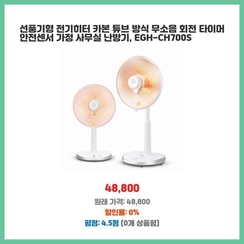시즌 맞춤 선풍기형 전기히터 카본 튜브 방식 무소음 회전 타이머 안전센서 가정 사무실 난방기 EGH-CH700S 만족도가 높은 제품