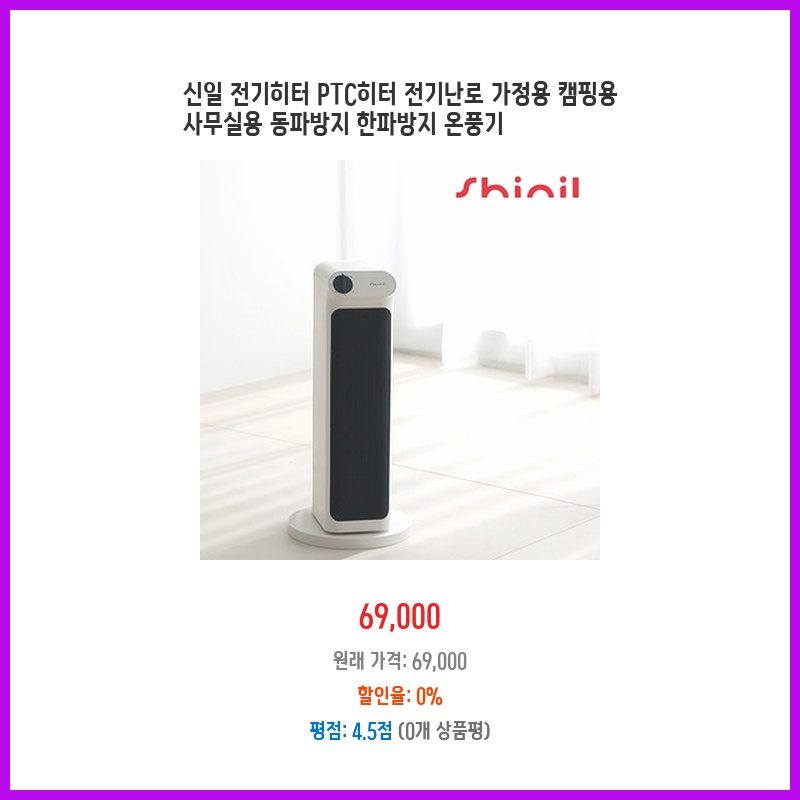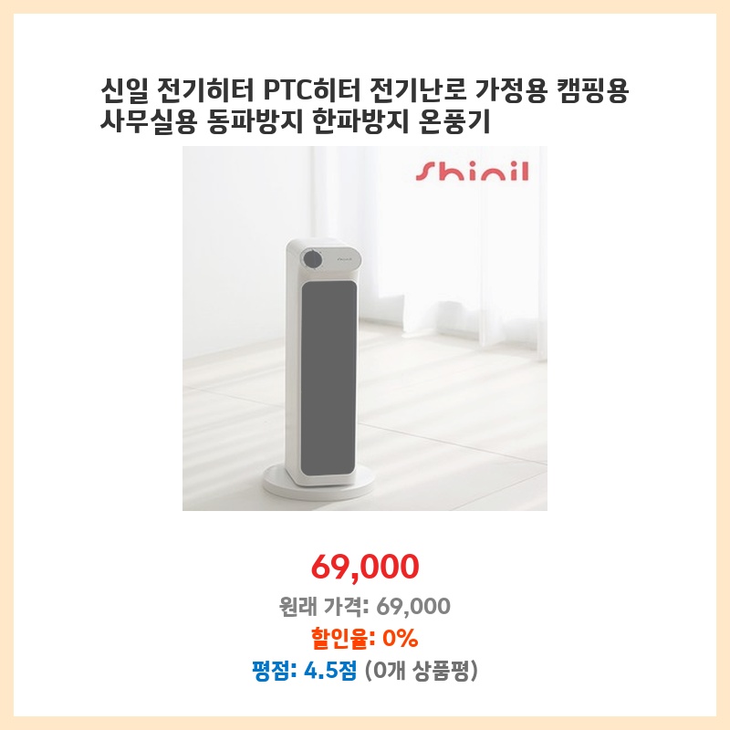 캠핑용으로 전기히터를 찾던 중, 신일 브랜드의 안정성과 PTC히터의 빠른 발열에 끌렸습니다. 가정용, 사무실용으로도 활용 가능하고 동파방지 기능까지 있어 실용성이 높아 구매했습니다. 가격 대비 성능이 괜찮아 보였습니다.