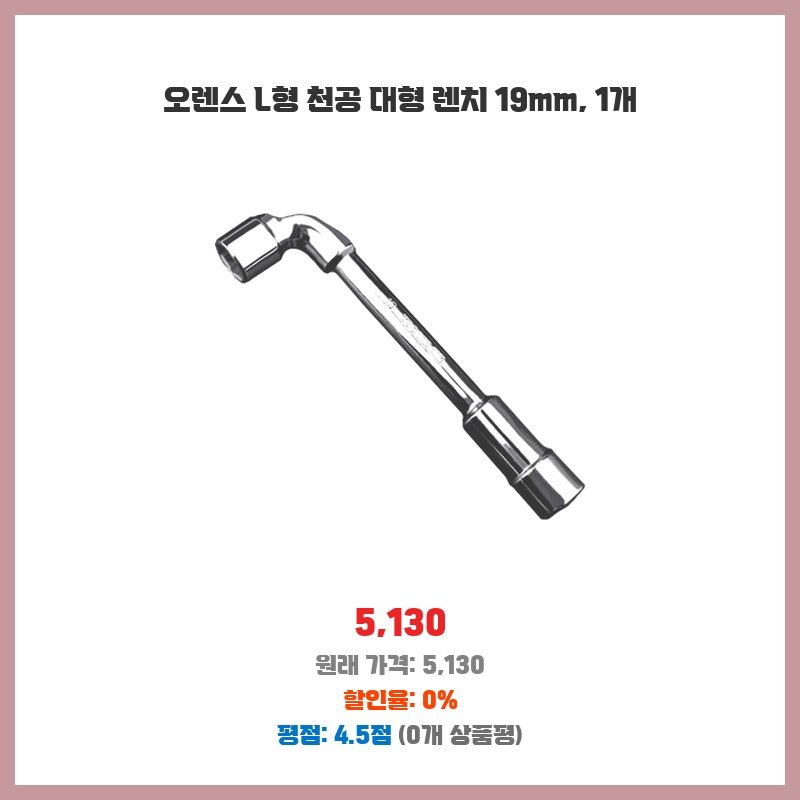 19mm L형 렌치가 필요했는데, 오렌스 제품은 천공 처리되어 볼트 체결 시 시야 확보가 용이하고 대형 사이즈라 작업 효율이 높을 것으로 예상되어 구매했습니다. 견고해 보이는 소재도 마음에 들었습니다.