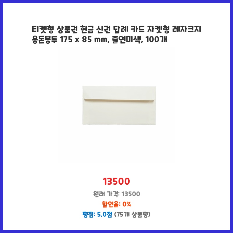 고급스러운 연미색 레이드지에 깔끔한 티켓형 디자인이 마음에 들어 결혼식 용돈봉투로 100개 구매했습니다. 넉넉한 수량과 적당한 크기(175x85mm)가 실용적이라고 생각했습니다.