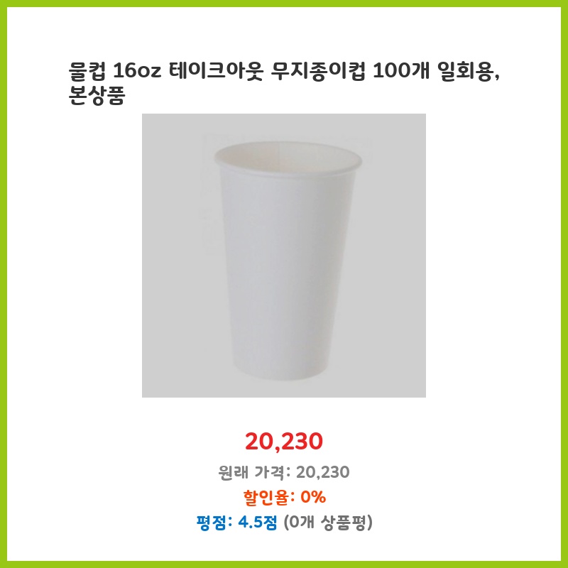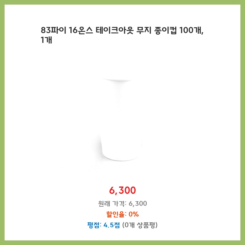 100개들이라 가성비가 좋고, 무지 디자인이라 활용도가 높아 행사나 매장에서 사용하기에 적합하다고 판단했습니다. 16oz 용량도 적당하고, 일회용이라 편리합니다. 종이컵이라 환경에 대한 부담도 비교적 적은 편입니다.
