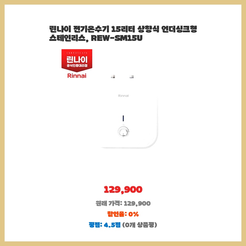 린나이 전기온수기 15리터 상향식 언더싱크형 스테인리스, REW-SM15U