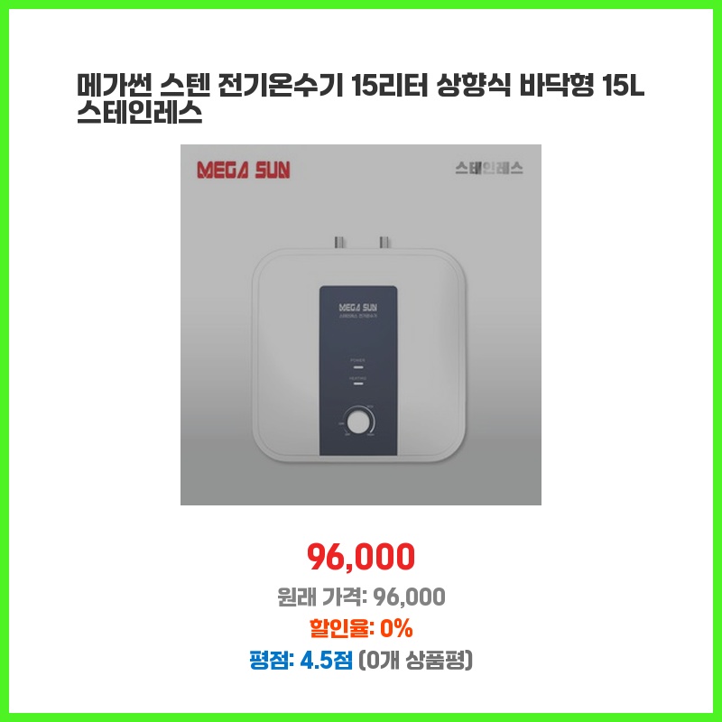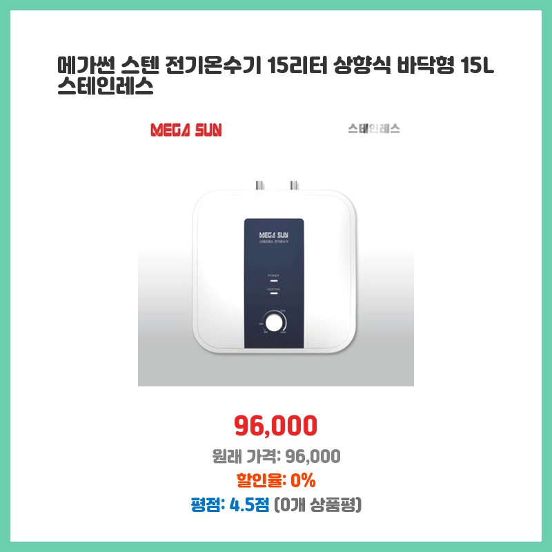 메가썬전기온수기, 전기온수기15리터, 15리터온수기, 상향식온수기, 바닥형온수기, 스텐온수기, 메가썬