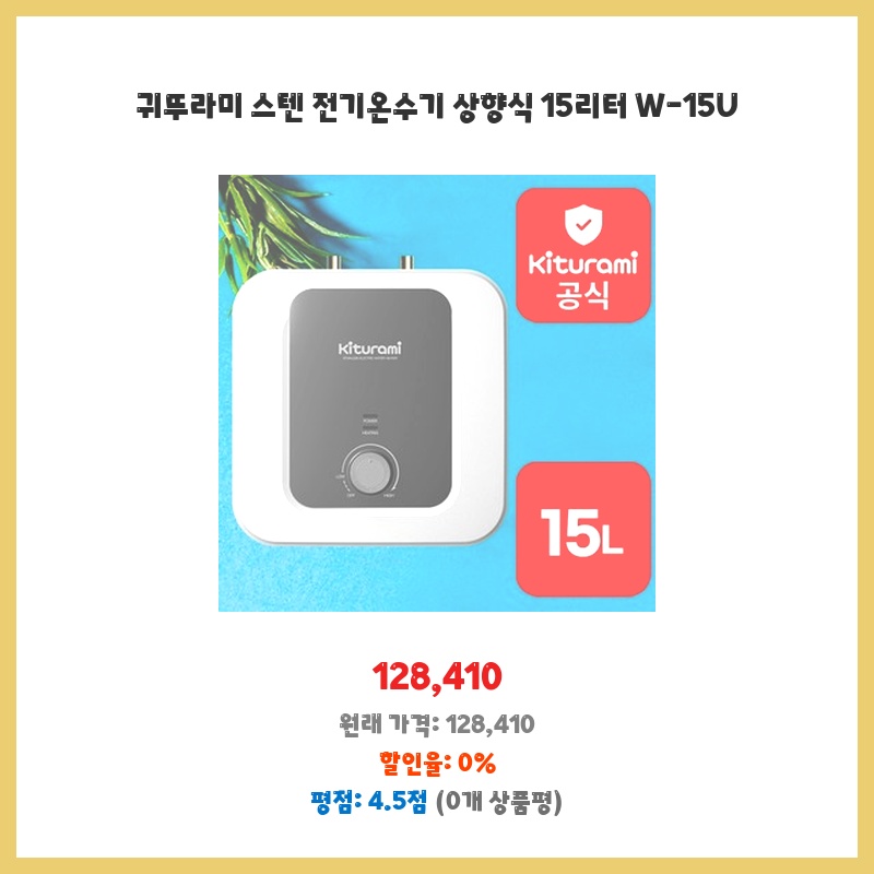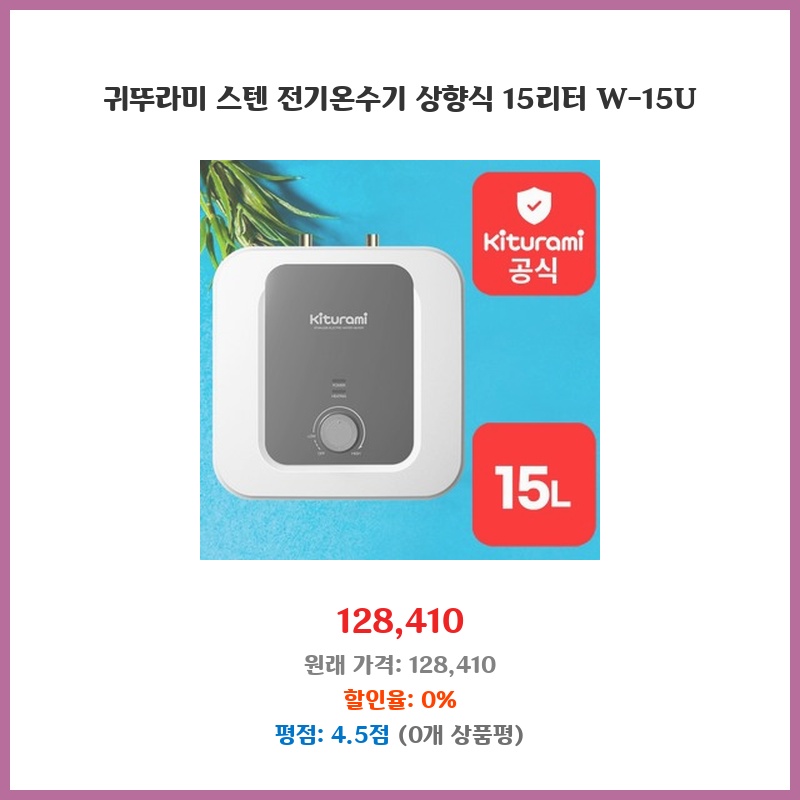좁은 공간에도 설치 가능한 콤팩트한 사이즈와 15리터 용량이 적당해서 구매했습니다. 스테인리스 재질이라 위생적이고, 상향식이라 온수 공급이 빠르다는 점이 마음에 들었습니다. 설치도 간편하다는 후기가 많았습니다.