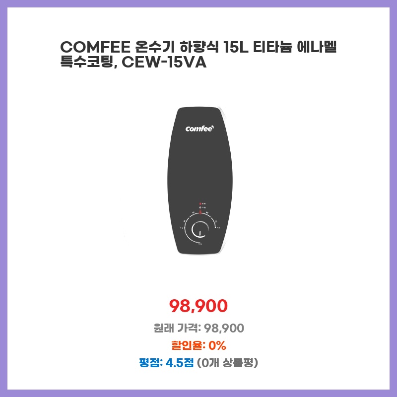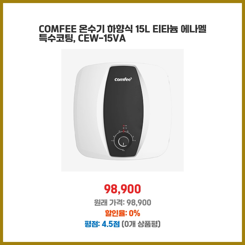 15L 용량에 티타늄 에나멜 코팅으로 위생적이고, 하향식이라 온수 사용이 편리할 것 같아 구매했습니다. 가격 대비 성능이 좋아 보였습니다. 콤팩트한 디자인도 마음에 들었습니다.
