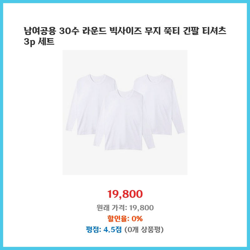 남여공용 30수 라운드 빅사이즈 무지 쭉티 긴팔 티셔츠 3p 세트