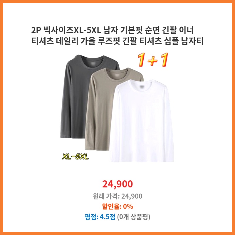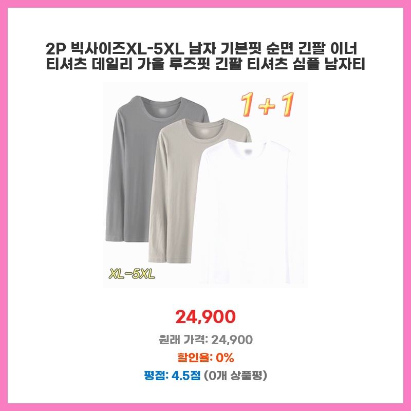 신상 업데이트 2P 빅사이즈XL-5XL 남자 기본핏 순면 긴팔 이너 티셔츠 데일리 가을 루즈핏 긴팔 티셔츠 심플 남자티 포인트 쏠쏠한 제품