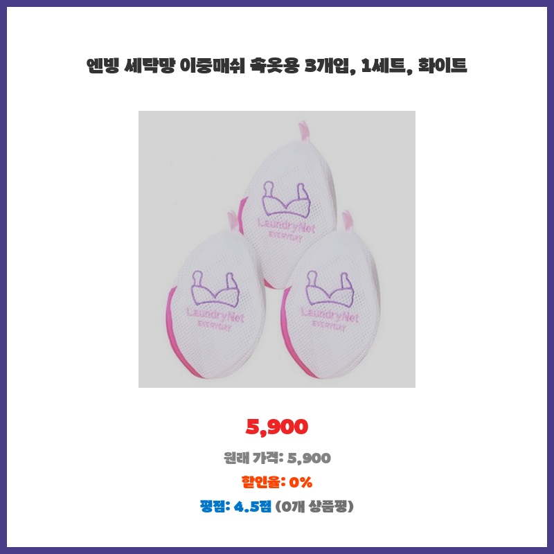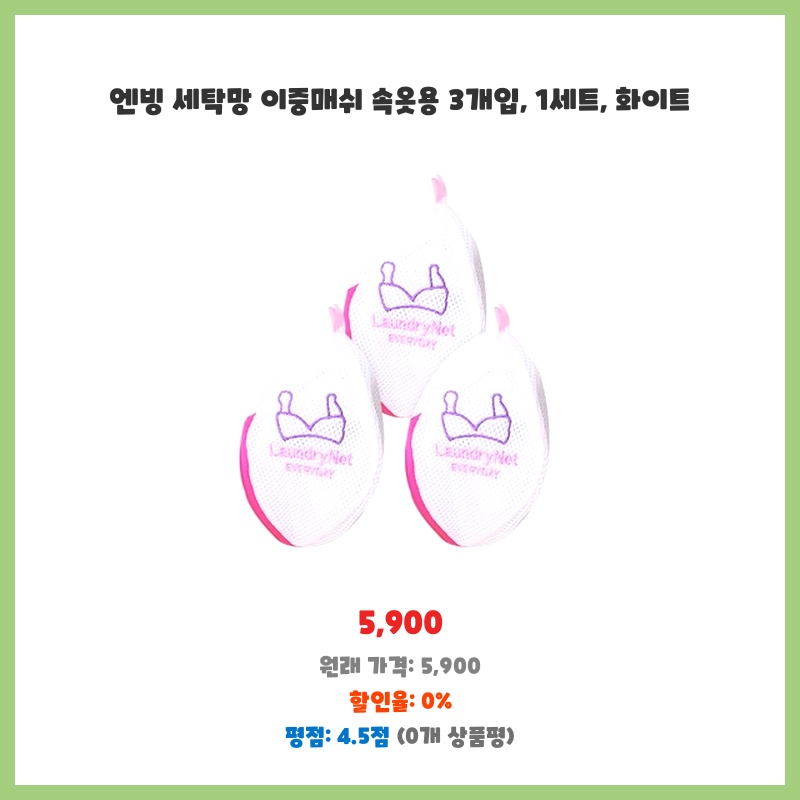 속옷 손상 방지와 세탁 효율을 높이기 위해 구매했습니다. 이중 매쉬 소재라 튼튼하고, 3개입이라 여러 속옷을 나눠 담을 수 있어 편리합니다. 화이트 색상이라 깨끗한 느낌도 좋습니다.