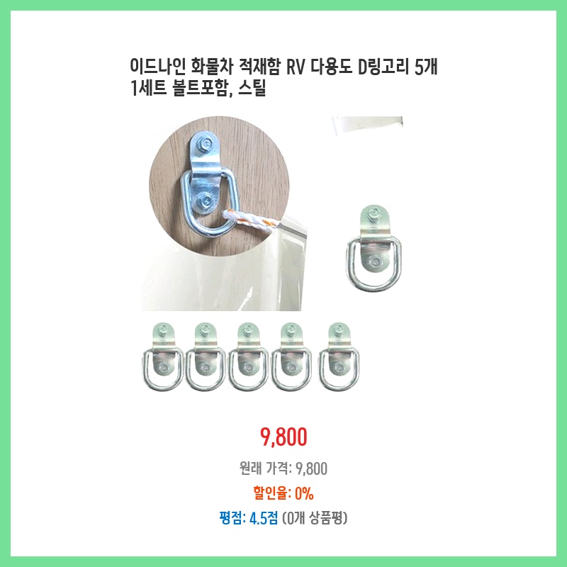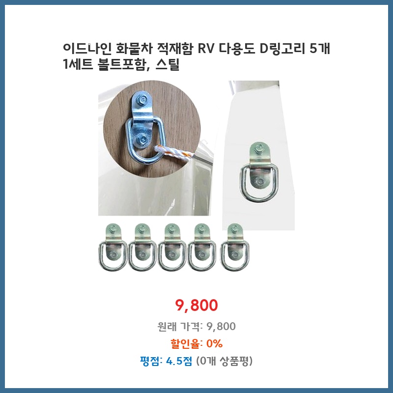 화물차 적재함에 짐 고정이 필요해서 D링을 찾던 중 가격 대비 튼튼한 스틸 소재에 5개 세트라는 점이 매력적이었습니다. 볼트까지 포함되어 있어 별도 구매 없이 바로 설치 가능한 점도 좋았습니다.