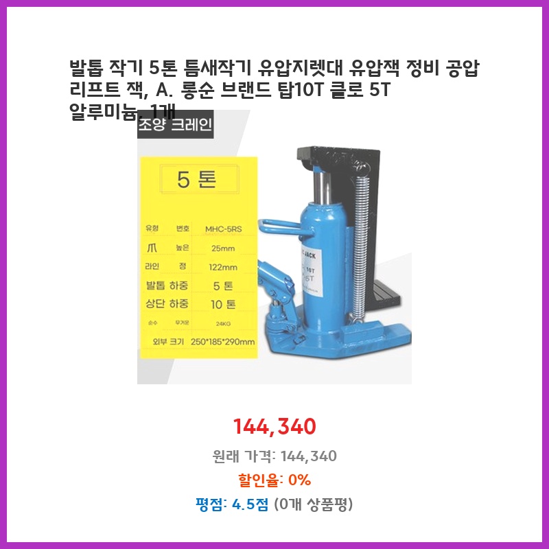 생각보다 가볍고 튼튼해서 작업이 수월했습니다. 좁은 공간에서도 문제없이 사용 가능했고, 5톤까지 거뜬히 들어 올려 만족합니다.