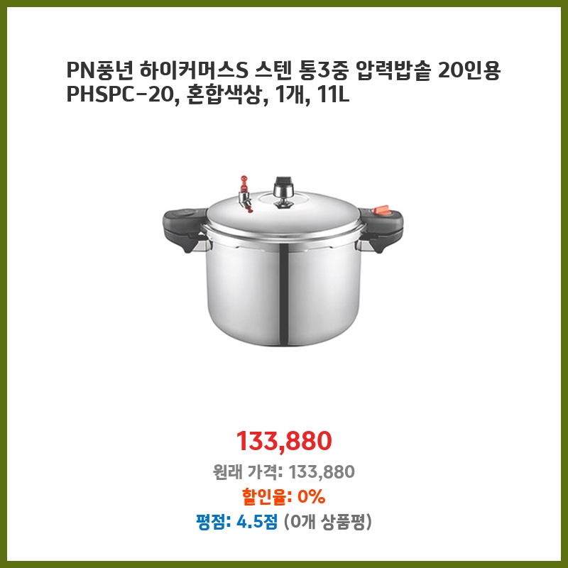 20인용 대용량이라 가족 모임이나 행사에 유용하고, 스테인리스 3중 압력솥이라 열효율이 높아 시간과 가스비 절약에 도움이 될 것 같아 구매했습니다. 내구성도 좋아 오래 사용할 수 있을 것으로 예상됩니다.