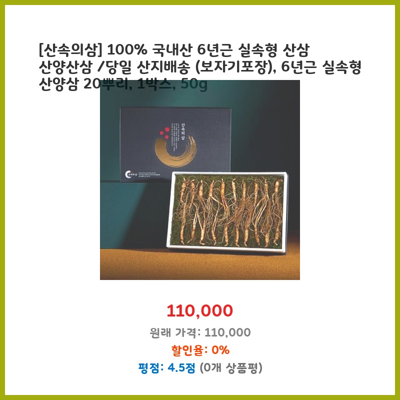 부모님 선물로 믿을 수 있는 국내산 산양삼을 찾던 중, 지리산 산양삼 5년근이라는 점과 산지직송으로 신선함이 보장된다는 점이 마음에 들었습니다. 10뿌리 구성으로 가격도 적당하다고 생각했습니다. 선물용으로 포장도 고급스러워 만족스러웠습니다.