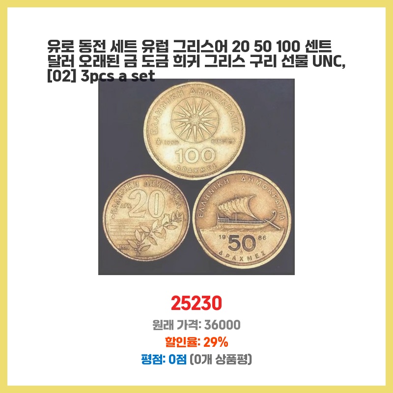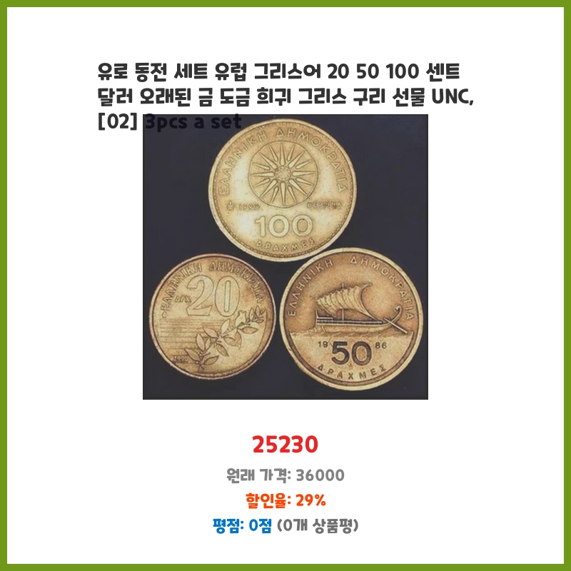 그리스 유로 동전의 희소성과 금도금의 고급스러움에 매력을 느껴 구매했습니다. 오래된 동전의 역사적 가치와 수집 가치를 생각했을 때 가격 대비 만족스러울 것 같습니다. UNC급이라 상태도 좋을 것으로 예상됩니다.