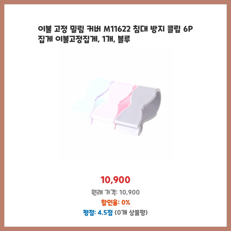 이불 덮고 자다 보면 자꾸 밀리는 게 스트레스였는데, 이 제품으로 깔끔하게 해결될 것 같아서 구매했습니다. 6개나 들어있어서 여러 곳에 사용 가능하고, 블루 색상도 침구랑 잘 어울릴 것 같습니다. 튼튼해 보이는 집게도 마음에 듭니다.