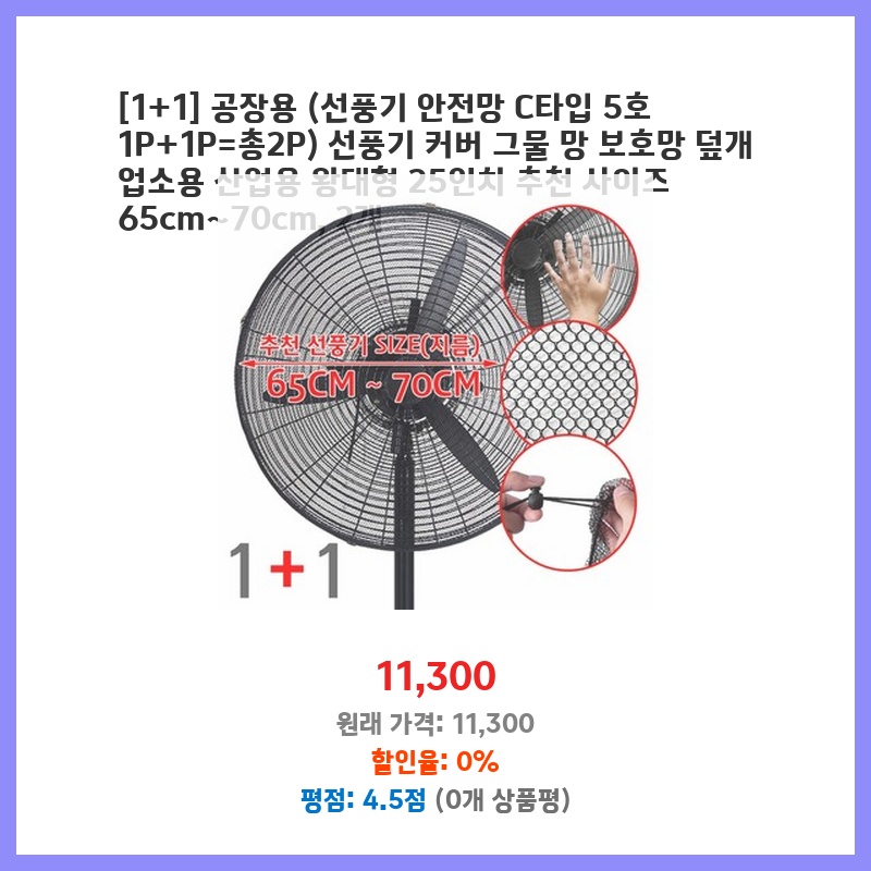 공장에서 사용하는 대형 선풍기의 안전을 위해 튼튼한 보호망이 필요했습니다. 2개 세트라 여유분도 있고, 25인치에 맞는 사이즈라 딱 맞아서 좋았습니다. C타입이라 설치도 편리했습니다.
