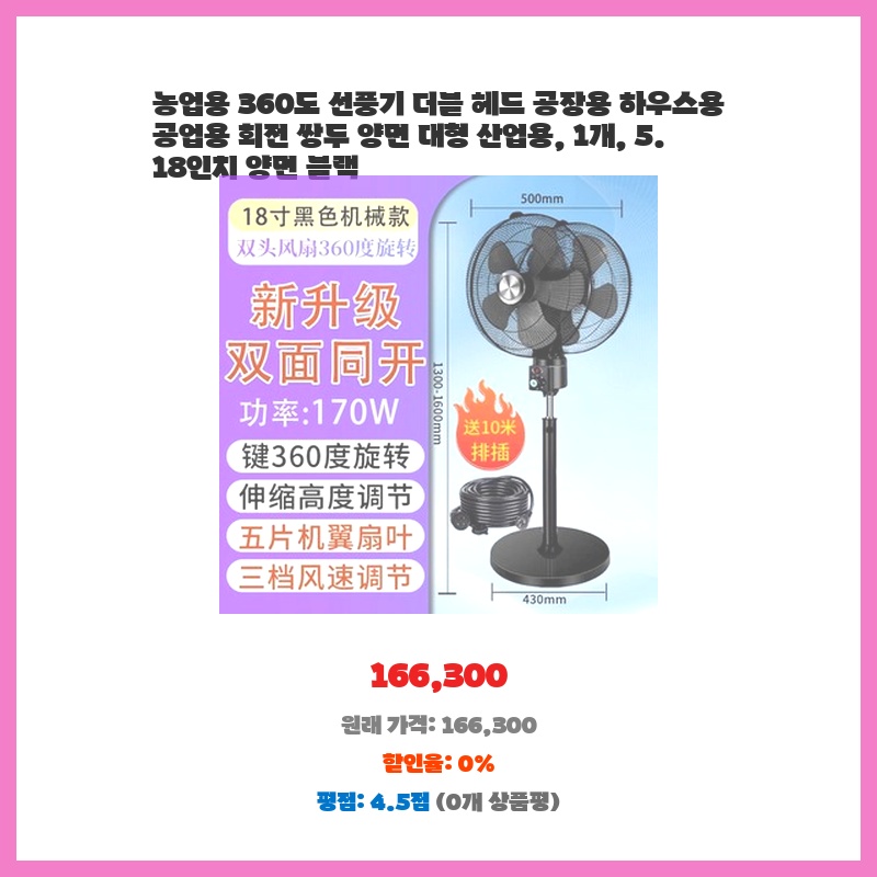 넓은 공간의 쾌적한 환풍이 필요해서 18인치 대용량 선풍기를 찾았습니다. 360도 회전 기능과 양면 날개로 넓은 면적을 효율적으로 시원하게 해줄 것 같아 구매했습니다. 업소용으로 튼튼하고 오래 쓸 수 있을 것 같아 기대됩니다.