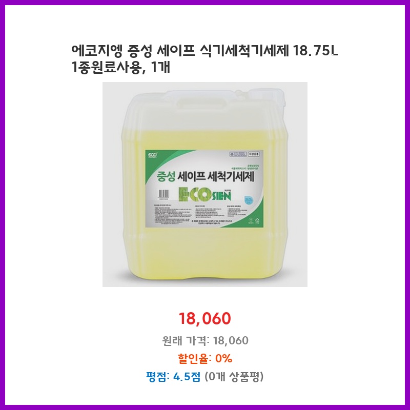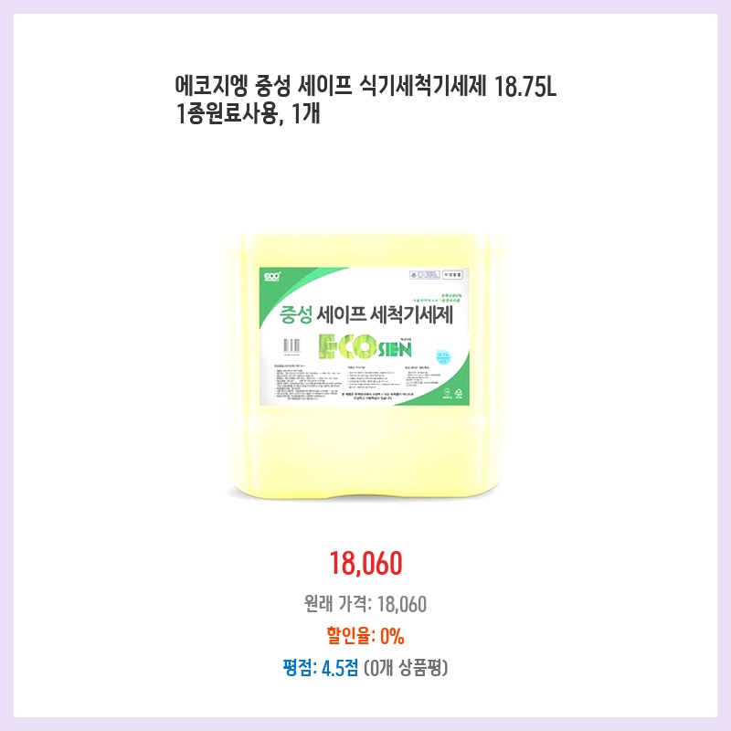 대용량에 1종 원료라 안심하고 사용할 수 있어서 구매했습니다. 아이 식기류도 안전하게 세척하고 싶었고, 경제적인 면도 고려했어요. 18.75L면 오래 쓸 수 있겠다는 생각에 만족스러워요.