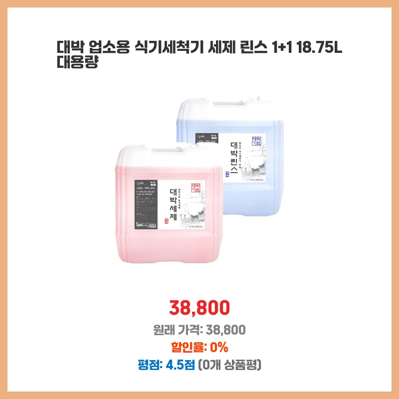 업소용이라 대용량인데 가격이 저렴하고 린스까지 포함이라 경제적입니다. 18.75L면 오래 쓸 수 있고, 두 개나 받으니 더욱 좋네요. 식기세척기 세제 교체 주기가 길어져서 좋습니다.