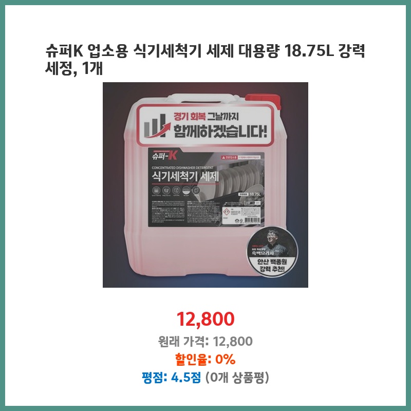 슈퍼K 업소용 식기세척기 세제 대용량 18.75L 강력 세정, 1개