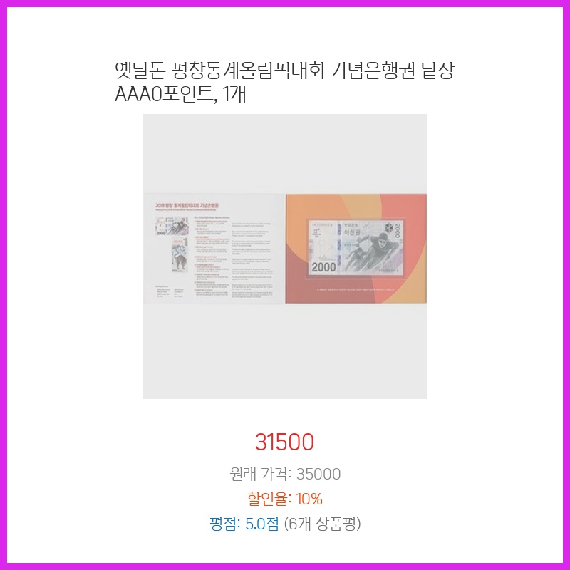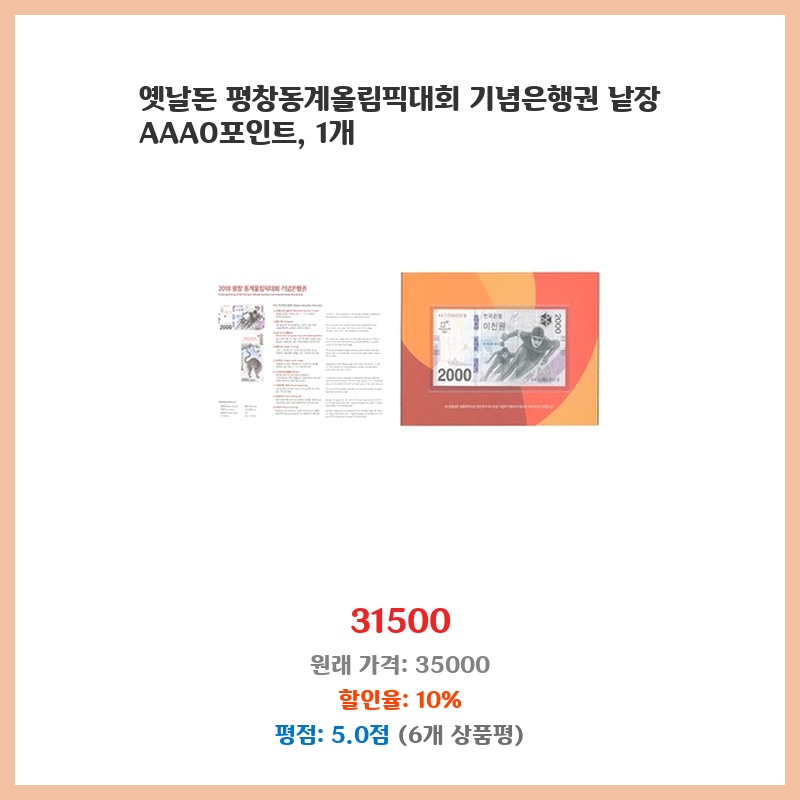 옛날돈 평창동계올림픽대회 기념은행권 낱장 AAA0포인트, 1개