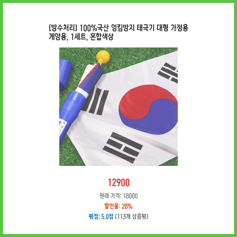 100 국산 태극기라 믿음직하고, 엉킴 방지 기능과 방수 처리까지 되어 오래 사용할 수 있을 것 같아 구매했습니다. 대형 사이즈라 가정용으로 적합하고, 가격도 합리적이라고 생각합니다.